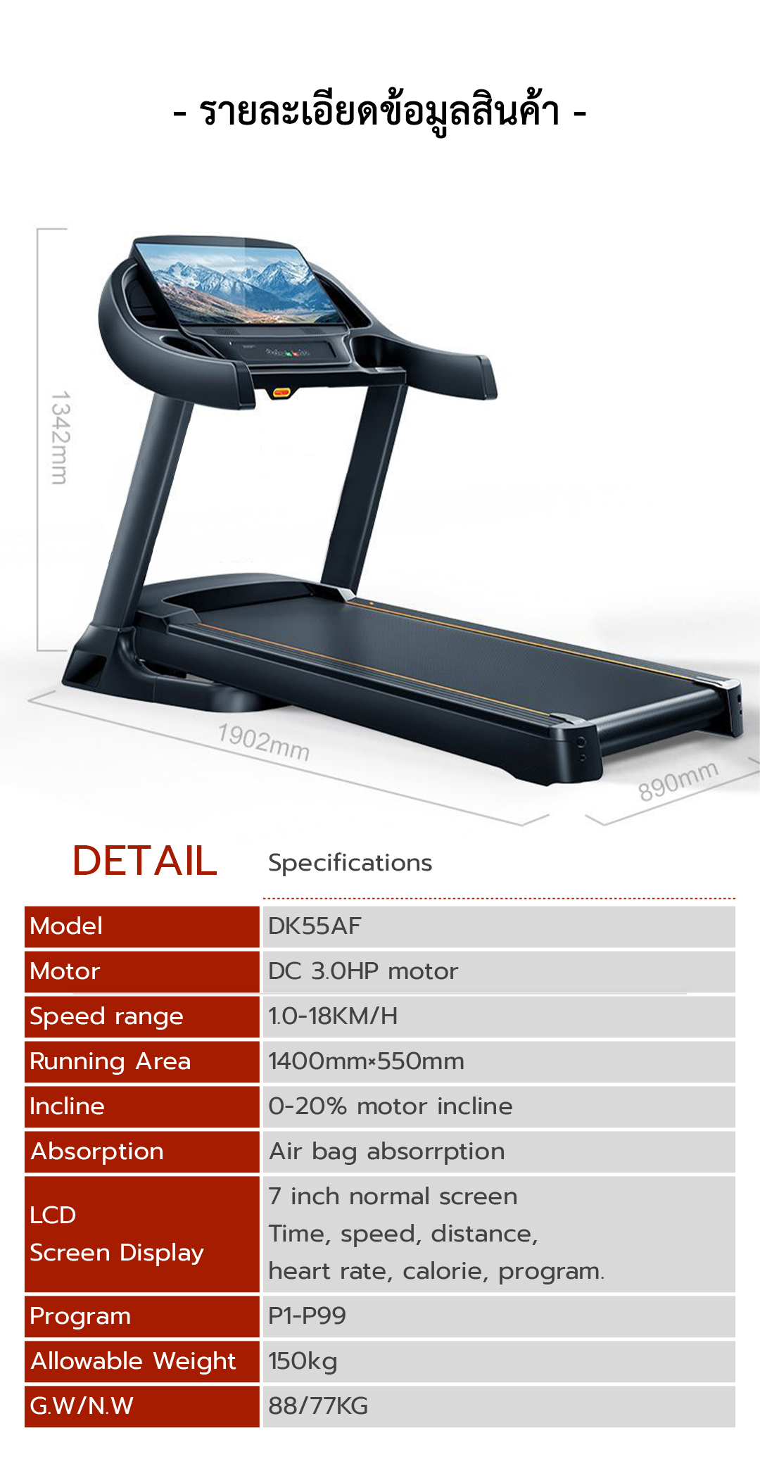 | หน้าจอแสดงผล (LCD Screen) | 7 นิ้ว แสดงเวลา, ความเร็ว, ระยะทาง, ชีพจร, แคลอรี่, โปรแกรม |
